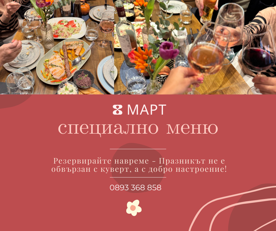 По повод 8 март подготвяме специално меню, което комбинира любими вкусове с по-изразителни акценти и десерти, които наистина заслужават финала на вечерта.